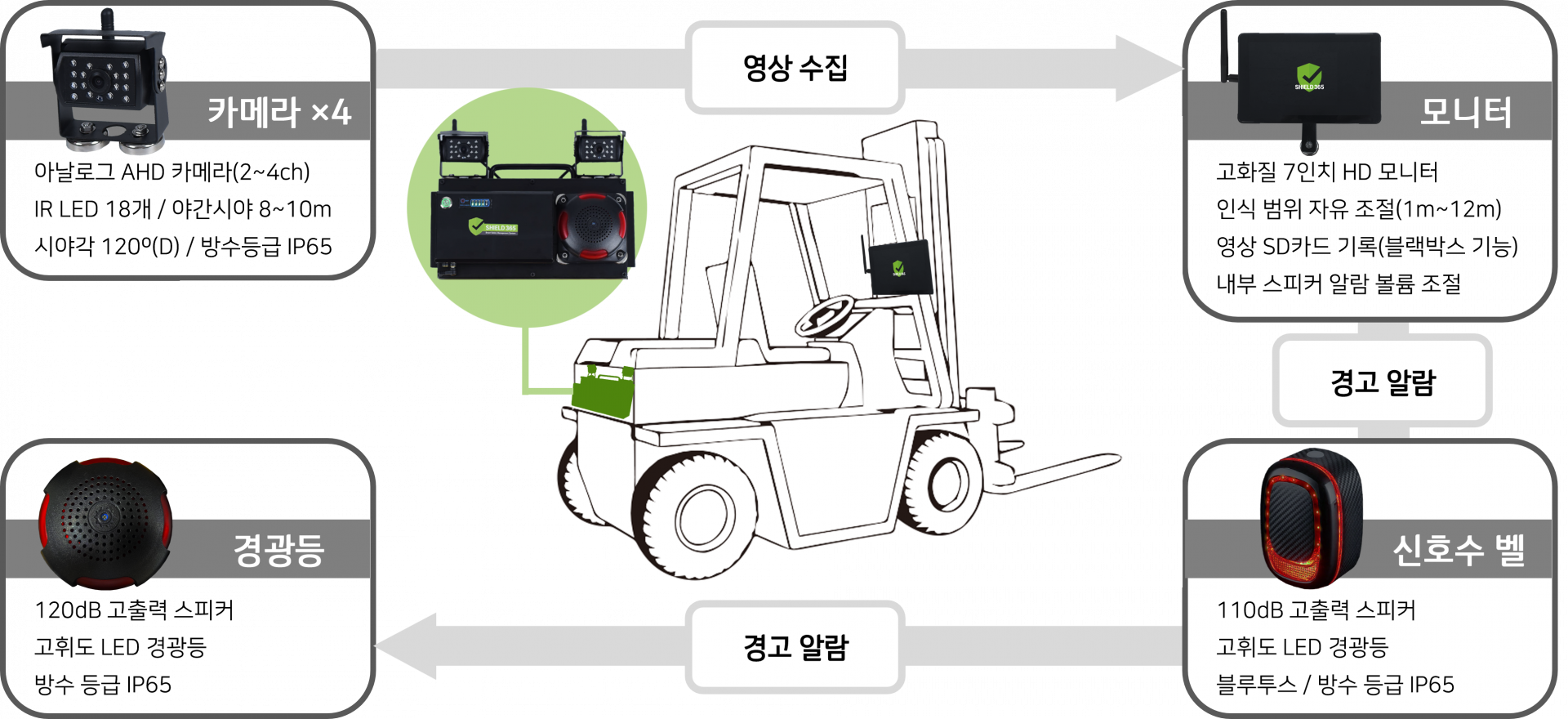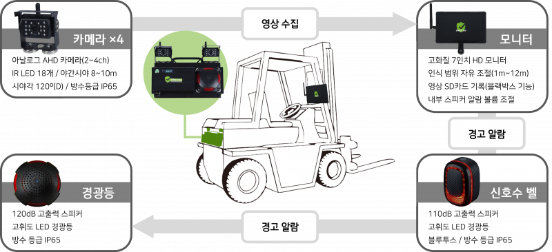 모든 산업용 차량(지게차, 굴삭기, 트랙터, 트럭 등)에 장착이 가능합니다.
